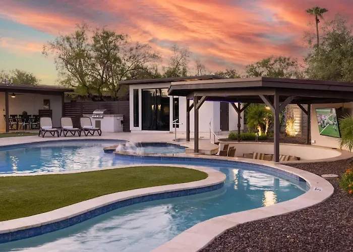 Situated 2.3 miles from Cosanti, the 6-bedroom Luxe Resort Retreat Scottsdale villa invites guests to relax at a patio. Guests can enjoy cycling at this 6-bathroom villa, located around 10 minutes' drive from Bella Terra Condominiums.